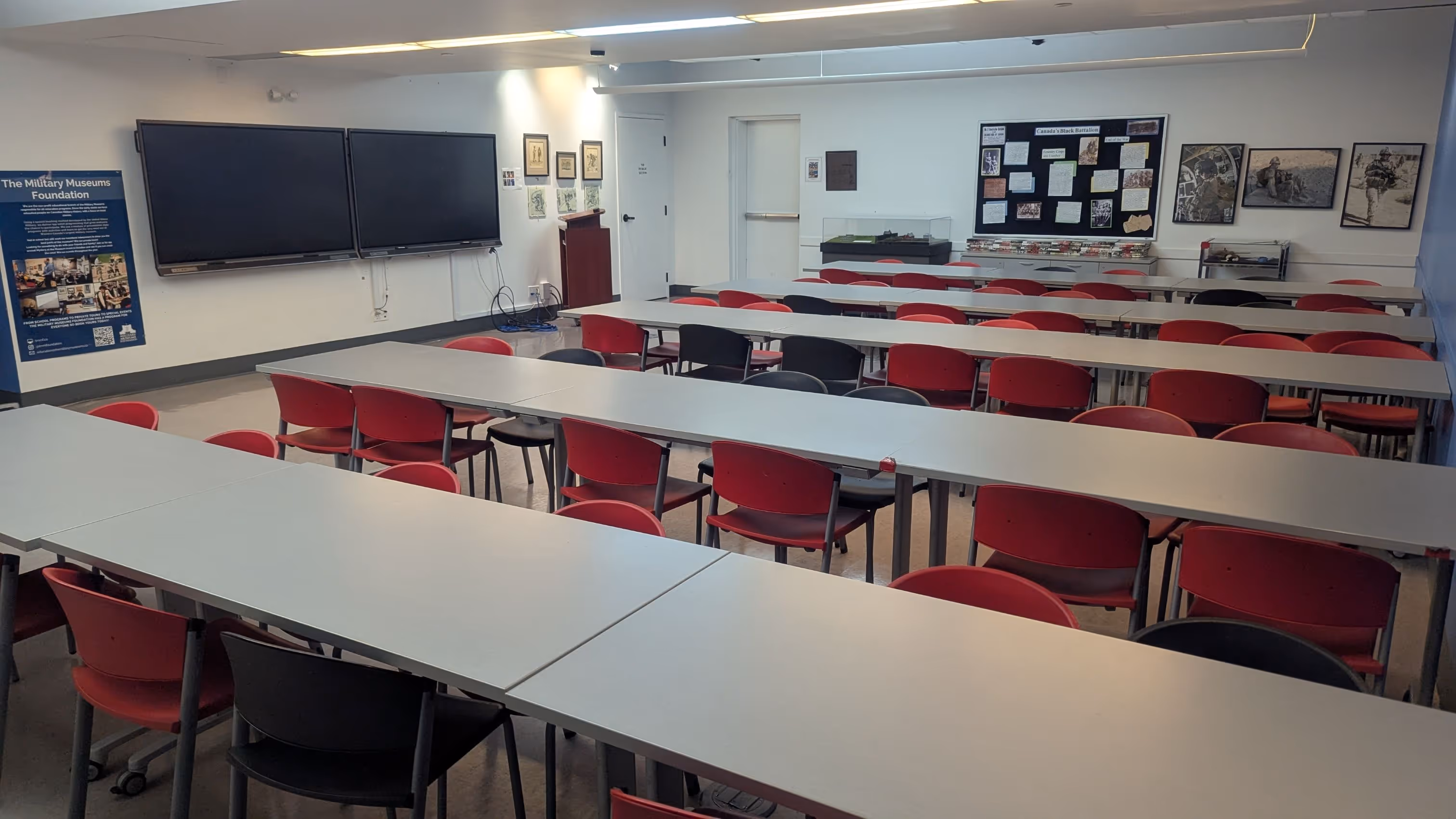The Education Centre is a functional and adaptable space at The Military Museums, purpose-built for classroom-style presentations, training sessions, and educational programming. The room is equipped with two Smartboards, supporting interactive presentations, collaborative learning, and multimedia use.