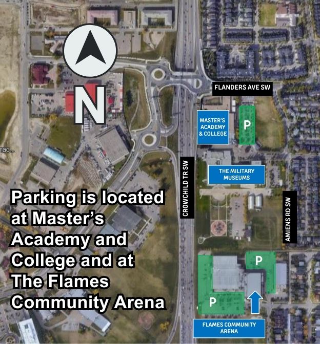 Parking will be available at Master's Academy and the Flames Community Centre both located on Amiens Road SW. Accessibility parking will also be available on the grounds at The Military Museums in our East Lot as you arrive through our main gate.