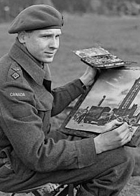 Shortly after graduating, Bobak joined the Canadian Army, as part of the Engineers. He was made an Official War Artist after winning an art competition in 1944. His wife to be, Molly Lamb, placed second in the same competition. Bobak later reflected that becoming a war artist may have saved his life, as most of the company he was with were killed their first day in Europe.